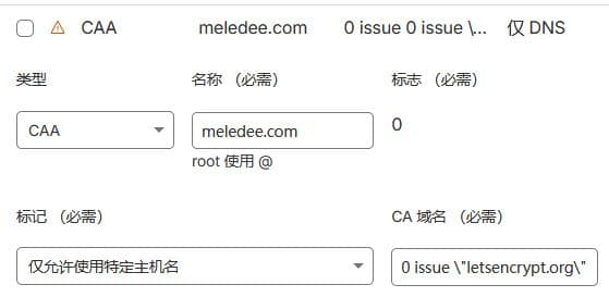 最后将生成的 CAA 记录,粘贴到您的 DNS 控制面板中。我使用的是 Let's Encrypt 免费证书,参数如下——