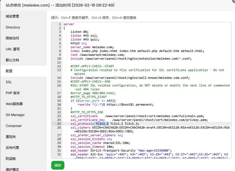 登录 aaPanel 面板/宝塔面板,点击“网站” -> 找到对应网站点击“设置” -> “SSL” -> “配置文件”。找到 ssl_protocols 设置,保留以下两个【TLSv1.2 TLSv1.3; 】,确保删除了 TLSv1.0 和 TLSv1.1,开启它们会导致 HTTPS 不安全。